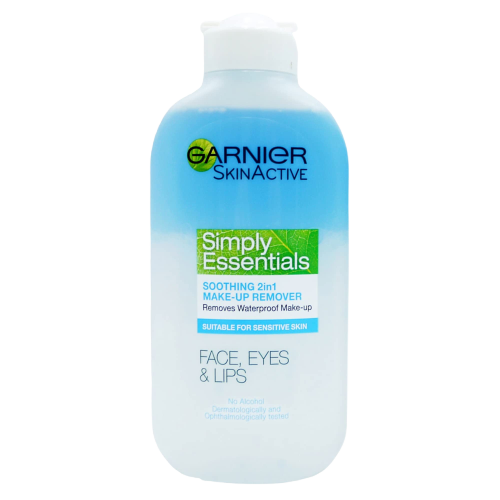 Garnier skin mineralssimply essentialsplant extract + pro-vitamin b52 in 1 make-up removerremoves even waterproof make-upno perfume or alcoholdermatologically and ophthalmologically testedis garnier simply essentials 2 in 1 make-up remover right for me? yes, if your skin feels fragile when cleansing yes, if changes in temperature, fatigue or stress leave your skin feeling more sensitive. yes, if you have sensitive skin and are looking for effective make-up removal.How does it work? garnier simply essentials 2 in 1 make-up remover contains plant extract and soothing pro-vitamin b5 in a 2 in 1 formula which combines the efficacy of a make-up removing oil (blue liquid) with the freshness of a cleansing water (clear liquid) in a single express wipe.Result: your skin is perfectly cleansed with no residue. Even waterproof make-up is removed. Skin is left feeling soft and supple.How do i use it? shake the bottle to mix the two liquids, then soak a cotton wool pad with the mixture and wipe gently over the face, eyes and neck to remove make-up. Repeat until your skin is perfectly clean.Garnier skin naturals products:use, wherever possible, naturally derived active ingredients which have been carefully extracted to preserve their quality and purity.Have been formulated and dermatologically tested to ensure their effectiveness and respect for your skin.694746 4-ingredients: aqua/water, cyclopentasiloxane, isohexadecane, isopropyl palmitate, panthenol, rosa centifolia / rosa centifolia flower water, dipotassium phosphate, poloxamer 184, polyaminopropyl biguanide, potassium phosphate, sodium chloride