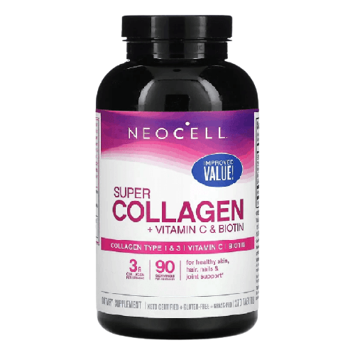 NeoCell Super Collagen + Vitamin C & Biotin is a dietary supplement designed to support healthy skin, hair, nails, and joints. Each serving delivers 3 grams of collagen, complemented with Vitamin C and Biotin, which are essential for collagen synthesis and overall beauty and wellness.